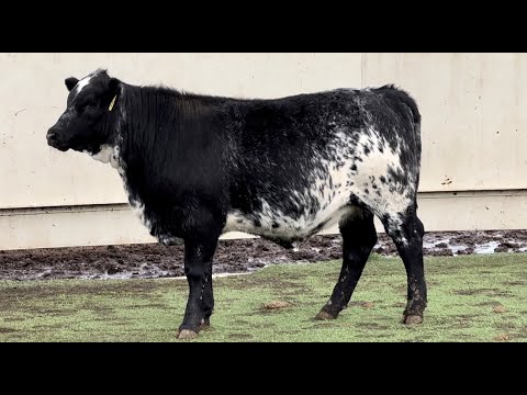 Here’s a hefty lady that is super unique colored! This female has absolute phenomenal center body capacity and will make an ultra easy keeping momma cow. She will produce thick, choice grading offspring. This heifer would make a great recip too!